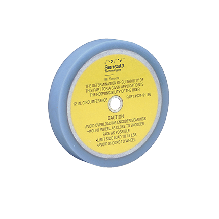 This measuring wheel uses an 80 durometer urethane rolling surface vulcanized to an aluminum hub and then machined to a circumference of 12 inches. It is designed to be used with shafts of 3/8″, 1/2″ or 5/8″ diameter depending on the model. It should be installed with the hub side facing away from the encoder housing. Maximum recommended service load is 15 pounds.